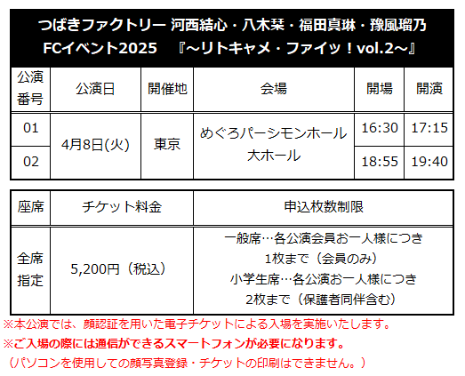 「つばきファクトリー 河西結心・八木栞・福田真琳・豫風瑠乃FCイベント2025 『~リトキャメ・ファイッ!vol.2~』」開催決定!